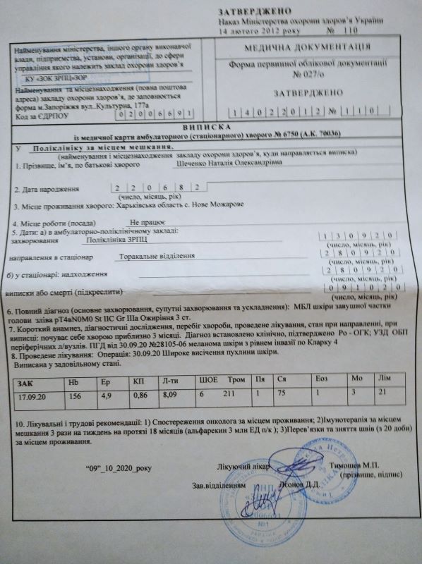 Наталье Шевченко из Запорожья - 38 лет, и у неё двое замечательных дочерей 10 и 15 лет. Казалось бы, обычная семья, которую беды должны обходить стороной. Но в конце сентября 2020 все изменилось: в запорожском онкодиспансере Наташе удалили родинку, которая после гистологического анализа была определена как злокачественная. Был поставлен диагноз - меланома (рак кожи) 2 стадии, но в декабре уже была 4 стадия. Метастазы поразили лимфоузел и лёгкие.