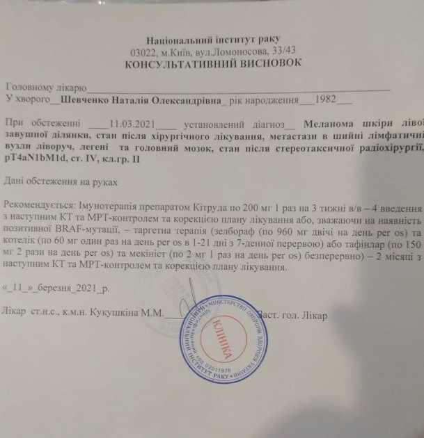 Наташа прошла 3 курса химии, после чего КТ показало, что болезнь прогрессирует и метастазы пошли в мозг. По рекомендации Национального института Рака в Киеве Наташа прошла облучение в Институет нейрохирургии. После этого врачи назначили дорогостоящее лечение химиопрепаратами - китруда и другими, ценой от 45000 грн за упаковку. Ресурсов простой семьи явно недостаточно, чтобы справиться с такой финансовой нагрузкой.
